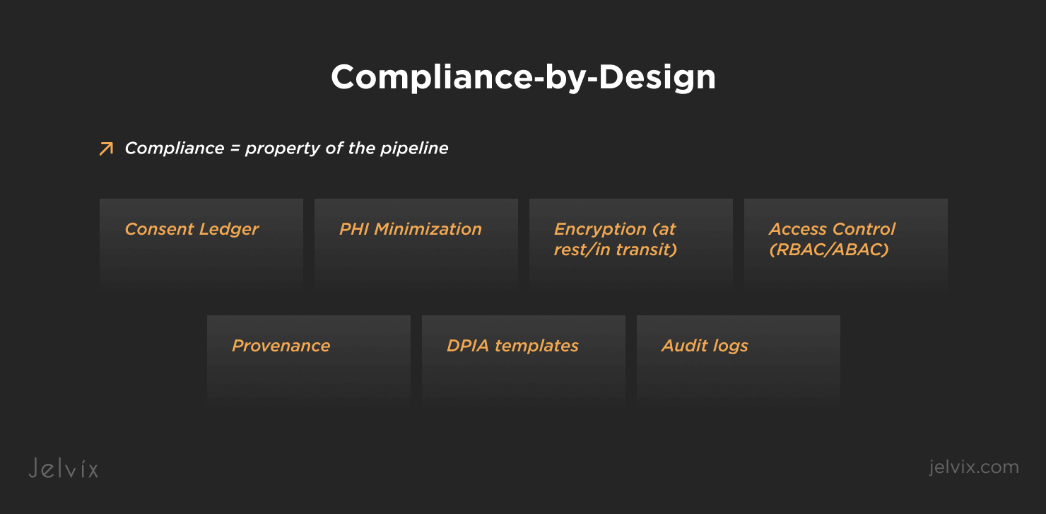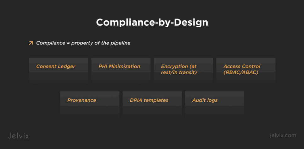 - Compliance‑by‑design: consent ledger, PHI boundaries, encryption, audit logs, and Provenance on every transformation.