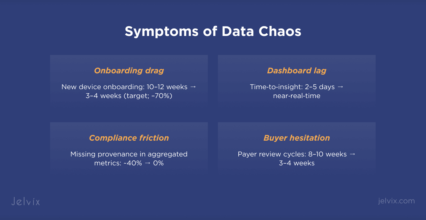 - Fragmented device & EHR feeds — vendor APIs, CSV drops, and site‑specific FHIR capabilities.