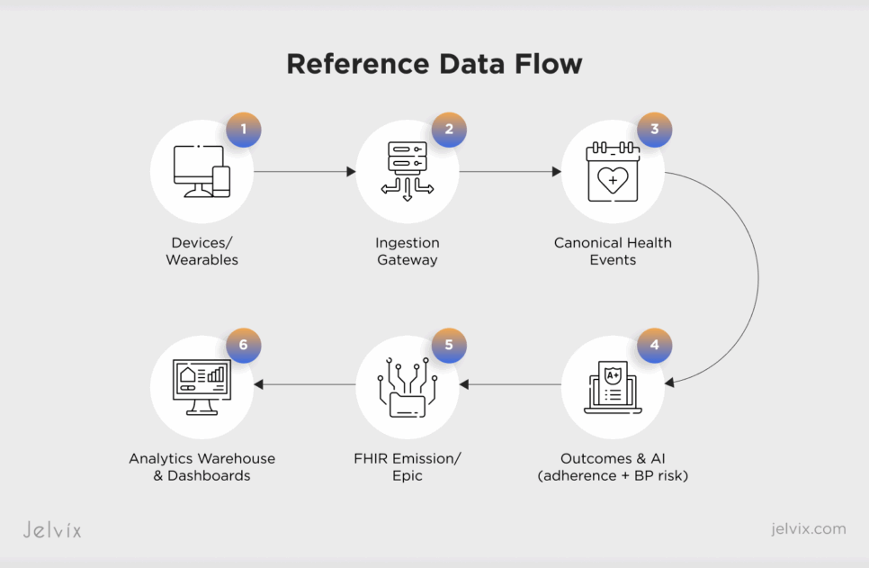 - Unified ingestion (FHIR + IoT): connectors for BP cuffs/wearables; webhooks and scheduled polling; buffering and de‑duplication.