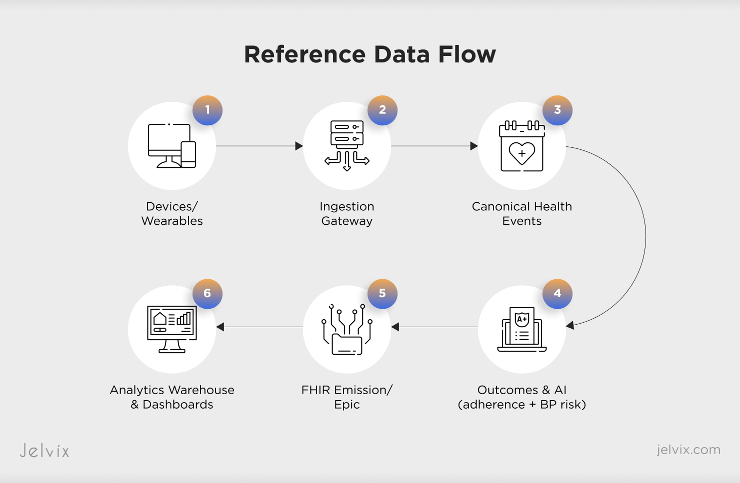 Devices & Wearables → Ingestion Gateway → Canonical Health Events → AI Services (adherence + BP risk) → FHIR Emission / Epic → Analytics Warehouse & Dashboards