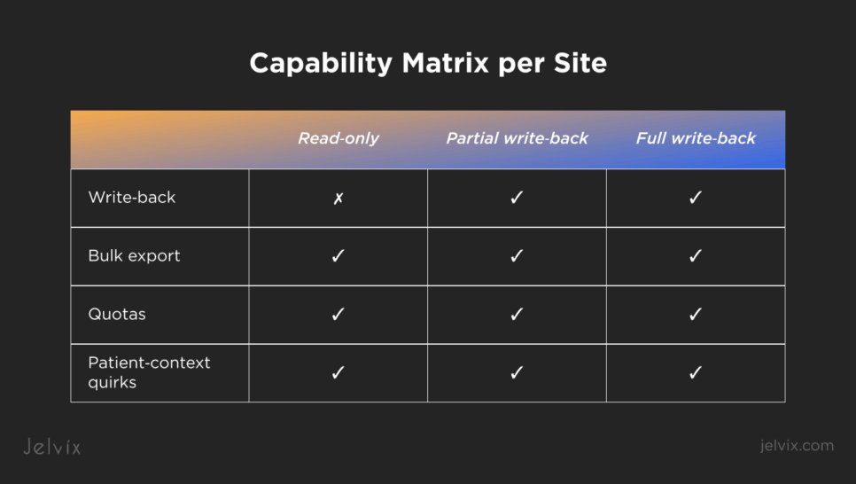- EHR integration: SMART on FHIR (user & backend); site capability matrix (read‑only / partial / full write‑back).