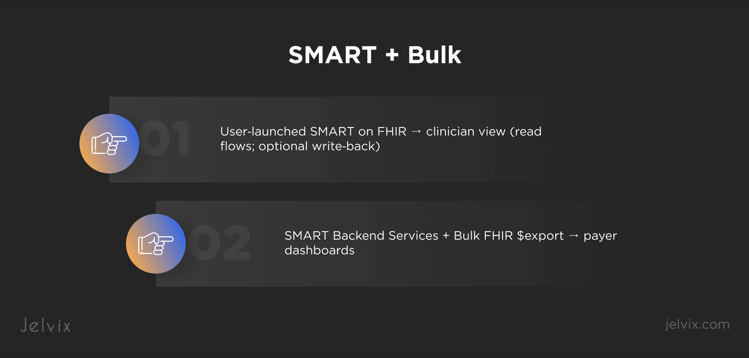 - Keep a two‑lane flow: near‑real‑time for clinician UX; batch (Bulk/Backend Services) for cohorts and payers.