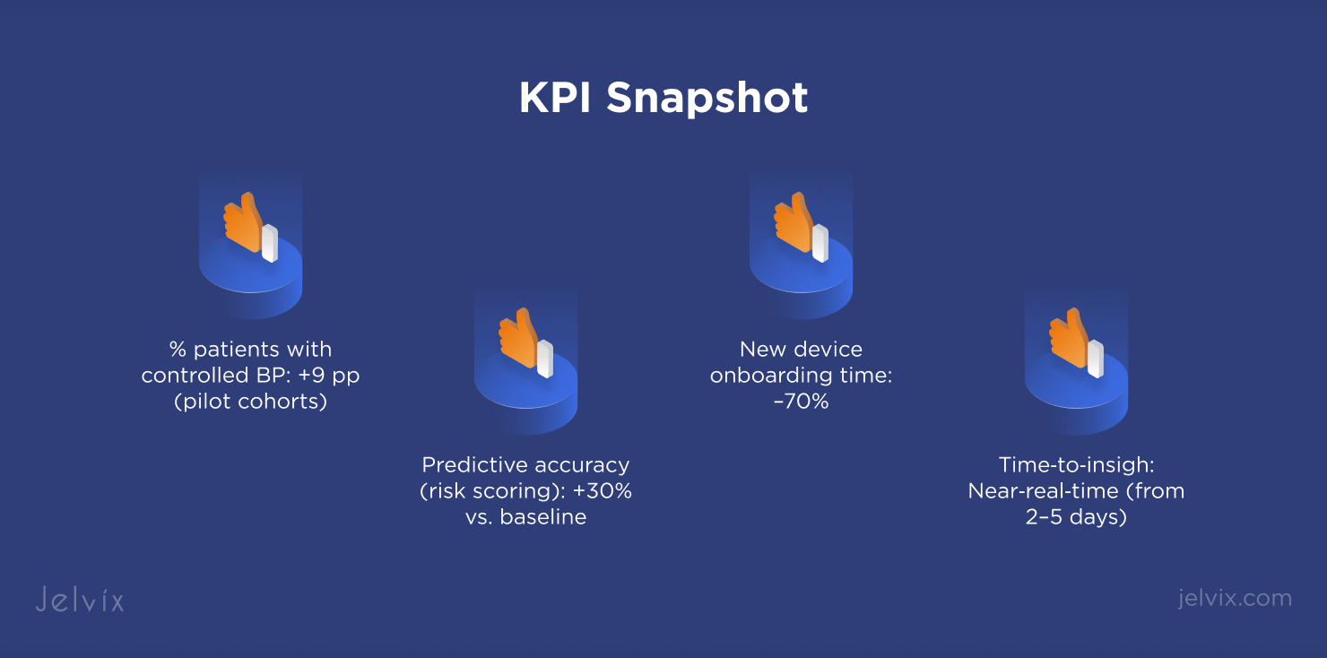 - Stand up near‑real‑time analytics tiles (adherence, elevated BP flags).