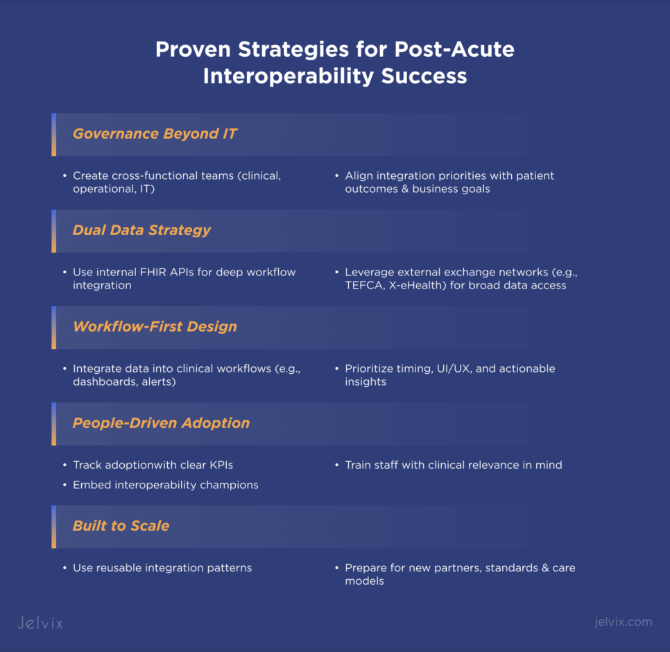 Post-acute interoperability that works is never just an IT initiative; it’s a change in the way the whole business works. Building interdisciplinary governance that connects clinical, operational, and technical leadership is one way to get started that has worked in the past.